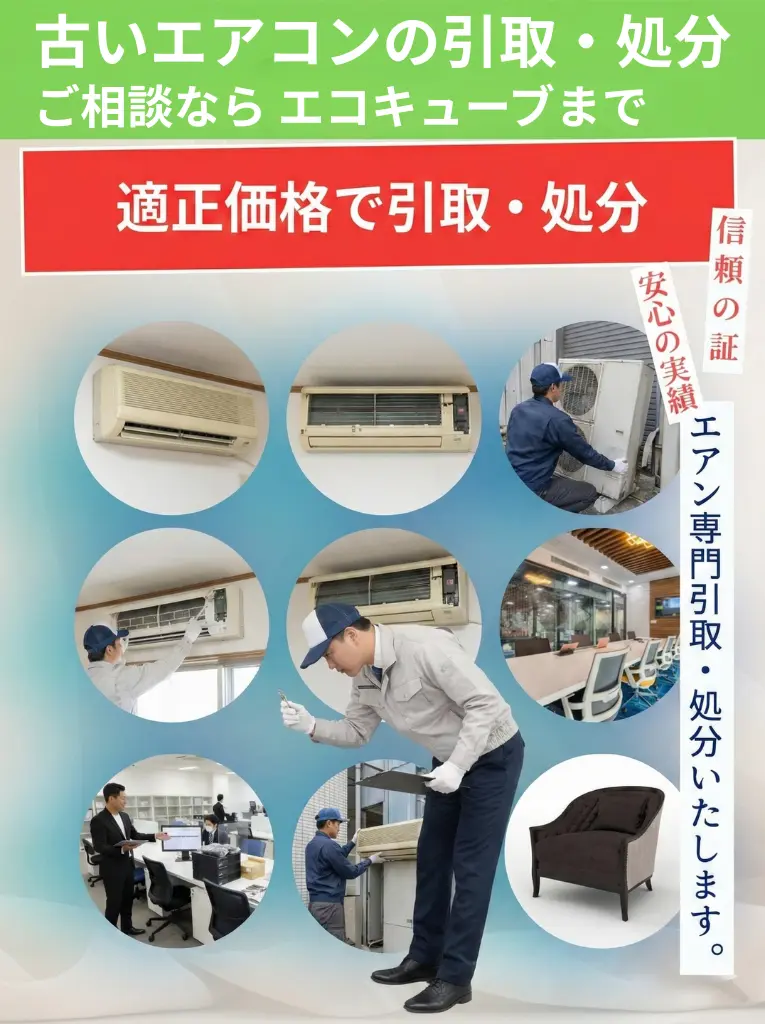 自治体の粗大ゴミでは回収できないエアコン(家電リサイクル法対象品目)。エコキューブなら、状態や年式を問わず回収いたします。
