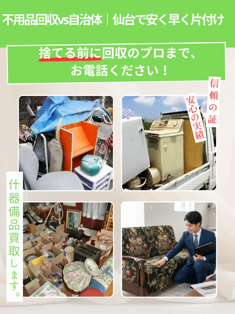 仙台で不用品を処分する際、「とにかく安く済ませたい」のか、「手間なくすぐに捨てたい」のかで正解は変わります。