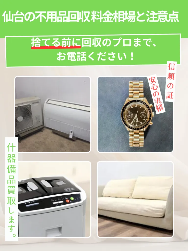 不用品買取エコキューブでは、仙台市および宮城県全域で適正価格での回収を行っています。さらに、「買取」を組み合わせることで、回収費用を大幅に安くするご提案も可能です。