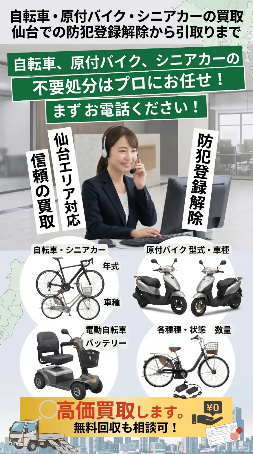 仙台エリアでの自転車・バイク・シニアカーの引取り費用相場から、面倒な各種手続き(防犯登録抹消・廃車)、そして「高価買取」になるプロの査定基準まで徹底解説します。