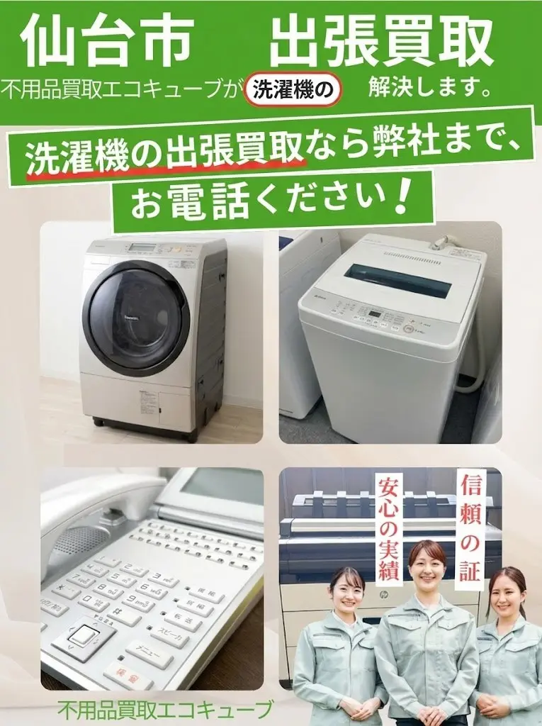 不用品買取エコキューブでは、仙台市および宮城県全域で洗濯機の高価買取を強化中です。