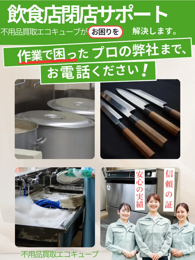 飲食店の閉店・厨房機器買取はお任せ。買取額を撤去費から差し引き、トータルの閉店費用を安く抑えます。
